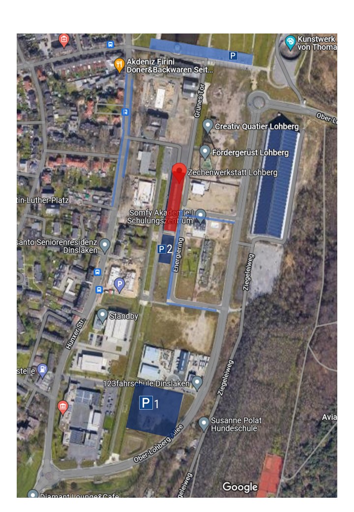 Der Zugang zum Zechengelände am Pförtnerhaus (Hünxer Straß 378) ist mit dem Auto nicht befahrbar. Sie erreichen die Zechenwerkstatt daher mit dem Auto nur von der Oberlohberg Allee aus.